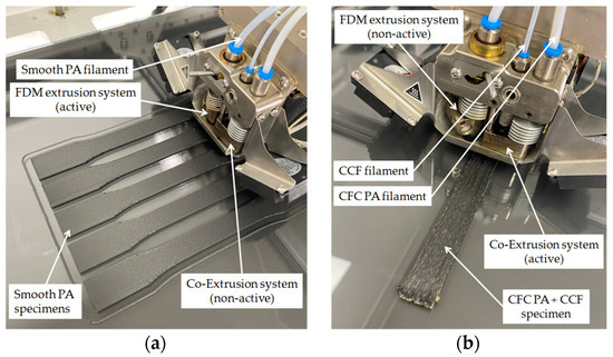 The promising AM technique chosen as a case study is the patented Anisoprint CFC (“Continuous Fibre Co-Extrusion”) technology. The machine Composer A3, which leverages the mentioned technique, has been used to manufacture the specimens. Such a technology produces a bi-matrix fibre-reinforced composite. The main feature is the co-extrusion of a continuous fibre filament, which is pre-impregnated and cured within a thermoset matrix, with a thermoplastic filament [21]. The printhead is composed by two different extrusion systems. One deals with the deposition of thermoplastic materials (or chopped reinforced thermoplastics) through a classical fused deposition modelling (FDM) technique. In contrast, the other one deals with the described co-extrusion process.