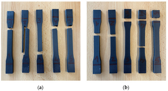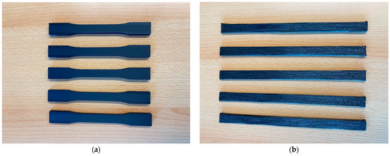 (a) Additively manufactured chopped FRP specimens, 0°; (b) additively manufactured continuous FRP specimens, 0°.