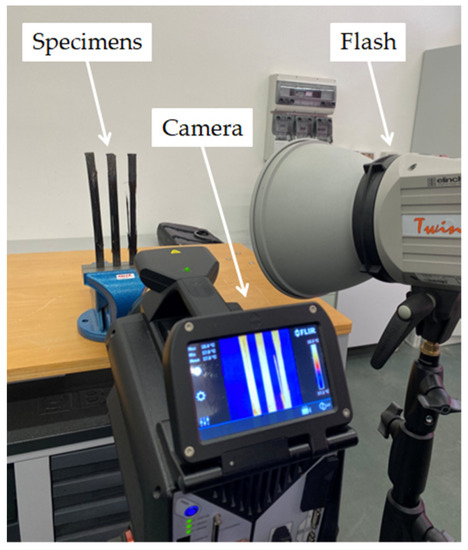 In addition, thermography has been used to highlight the preferential failure path in the specimens. The infrared camera used to perform the flash thermography tests is equipped with a cooled InSb focal plane array detector, having a spatial resolution of 1280 × 1024 pixels. The frame rate of the acquired thermograms was set to 130 Hz by sub-windowing at 640 × 720 pixels. The integration time was set at 362 μs, with a temperature range of 5 ÷ 90 °C. The lens was an MW 28 mm (38° × 31°) 2.0 HD. The camera was mounted on a tripod at a distance of 45 mm from the specimens, and the flash was placed alongside the camera. Figure 6 shows the setup for analysing the continuous FRP specimens oriented at 0°. The thermograms were post-processed by ResearchIR Max software by applying image subtraction. The palette was the iron bow one.
