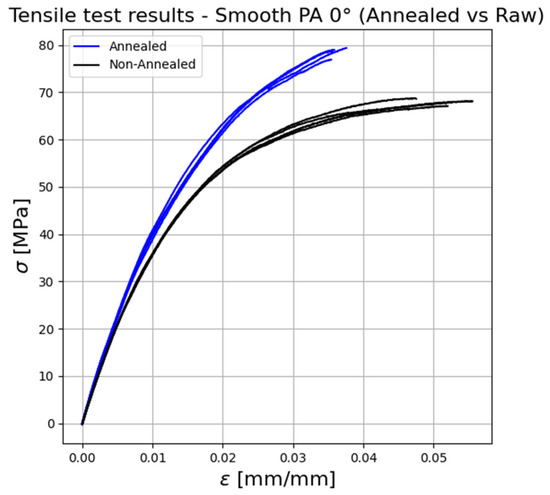 It can be seen that the thermally treated specimens show a tensile strength and Young’s modulus which is approx. 12% higher than the one of the non-treated (raw) specimens. A reversed trend is shown for the strain at the break, which is approx. 32% higher for the raw specimens. This behaviour can be explained by the increase in crystallinity in the polymer, which leads to better inter-layer bonding and to the reduction in residual stresses and gaps between layers (porosity), caused by the material re-flow when heated above its glass transition temperature [22].
