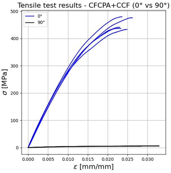 Figure 12 compares the stress–strain relationships obtained through the tensile tests carried out on continuous FRP with different deposition patterns (0°–90°). The mean values for tensile strength (σu), Young’s modulus (E), deformation at the break (), and their standard deviation are reported in Table 4.