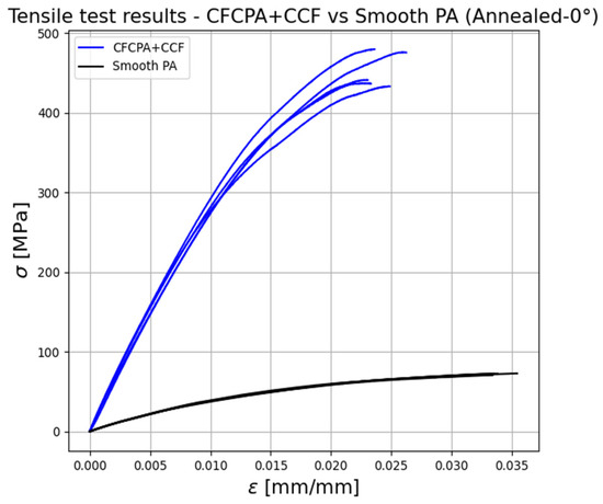 Figure 17 compares the tensile stress–strain relationships of the annealed chopped and continuous FRP oriented at 0°.