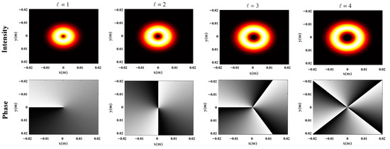 In addition to linear momentum, a light beam can also carry angular momentum, which can be divided into spin angular momentum (SAM) and OAM. SAM is associated with the polarization of photons and appears circular, whereas OAM is associated with helical phase wavefronts [17]. The biggest characteristic of an OAM beam is that it has a helical phase wave front, encircling the center. The phase of the light field changes, which determines the degree of torsion of the beam. The OAM beam with the same absolute value but an opposite sign of the topological charge changes in the opposite direction. The region of phase uncertainty is called the phase center singularity, where all rays interfere to form a hollow ring intensity distribution.