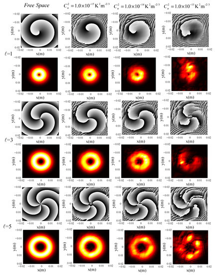 Figure 3 shows the spatial distribution of the LG beam () at different values of (, , and ) when . When , it is obvious that both the intensity and phase distribution maintain quite good integrity and the phase dividing line of the phase distribution is obvious. When , the integrity damage of LG beam intensity and phase distribution is very obvious and the helical boundary of the phase distribution is no longer smooth. When , the intensity distribution of the LG beam only retains partial annular distribution, the helical phase boundary of phase distribution shows obvious irregular jitter, and the distortion degree around the central singularity is significantly increased. In conclusion, OAM with a smaller value has stronger resistance to turbulence interference, which has also been verified by simulation through the support vector machine in a previous paper [26].