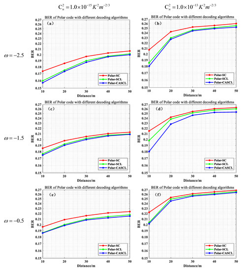Generally speaking, in the ocean turbulence channel, with the increase in the value of , three different decoding methods are seriously affected by turbulence and the bit error rate increases accordingly; further, the greater the turbulence intensity, the higher the bit error rate of the three decoding methods. The bit error rate of the system increases with the increase in transmission distance and sum. The best decoding performance is CASCL, while the performance of the SCL decoding algorithm has little difference from the CASCL decoding algorithm, and the worst performance is found for the SC decoding algorithm. The reason for this situation is that the SCL decoding algorithm and CASCL decoding algorithm consider multiple paths when making a judgment, instead of choosing only the path with the highest metric value for downward expansion, as the SC algorithm does.