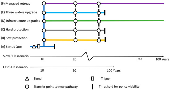 There are several decision-making processes available that facilitate pre-emptive adaptation decisions and which address uncertainty and changing risk in situations where the stressor is ongoing, such as SLR [8,10,23,24]. Dynamic Adaptive Pathways Planning (DAPP) is one such method and has emerged as a ‘fit-for-purpose’ method for climate change adaptation planning to address widening future uncertainty where the risk is changing over long planning timeframes [8].