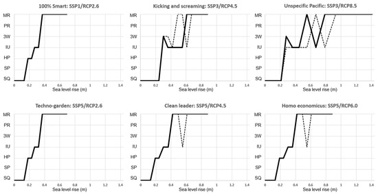 The other two scenarios (Kicking and screaming and Unspecific Pacific) are different; these two scenarios are SSP3. There is more pathway variability in these two scenarios–the model predicts a different sequence of adaptive actions will most likely be triggered in these two scenarios from the other four, and both scenarios also differ from each other—adaptive actions are not triggered at the same level of RSLR in these two scenarios.
