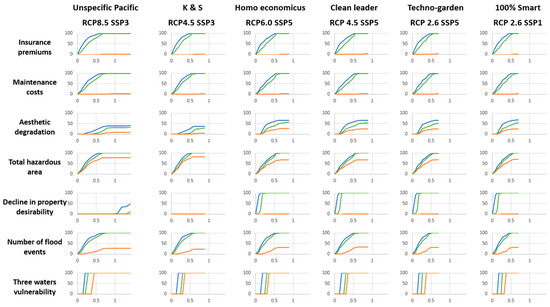 A comparison between Figure 6 and Figure 7 shows that implementation of adaptive actions can delay reaching adaptation thresholds but does not prevent them being reached. This highlights the importance of preventing new development in hazard-prone areas; further intensification in areas currently being ‘defended’ by any type of adaptive action means that the adaptive action itself is maladaptive, increasing the exposure to future hazards. As DAPP is intended to avoid maladaptive action [25], increasing exposure to hazards needs careful consideration when adaptive actions are chosen by asking under what conditions will the option fail, and will it lock in further development and increase exposure when the option fails.