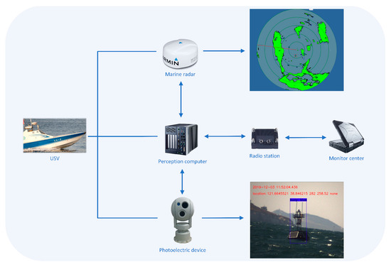 Marine radar can obtain object information on distance, direction, speed, and heading. The perception computer consists of a communication module, a radar module, a defogging module, a detection-tracking module, and a decision module. The communication module is used for information transfer between the sensors and the perception computer. The radar module analyzes the object information and removes false objects caused by waves. The defogging module is used to defog the foggy images to improve their quality. The detection-tracking module is used for object detection and object tracking. The decision module determines the process to complete the mission based on the current mission requirements. The photoelectric device consists of a camera sensor and a laser sensor. The image obtained by the camera is essential information for object detection [17,18,19,20]. The laser sensor is used for the precise positioning of the object. The positioning information from laser sensors is more accurate than that from marine radar. As shown in Figure 3, the information transfer diagram of the USV perception system is shown.
