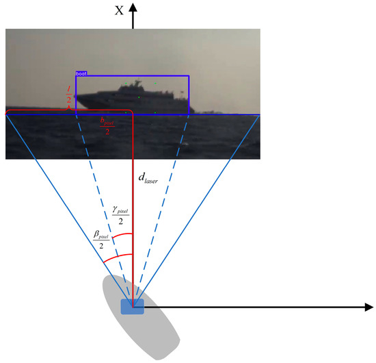 The field-of-view adaption algorithm is an algorithm that adaptively adjusts the field of view of the photoelectric device according to the object’s distance and size. After the photoelectric device obtains the information of the radar-guided object, the photoelectric device calculates the longitude and latitude information of the object to obtain the azimuth information. The photoelectric device rotates, and the radar-guided object appears in the field of view. After the marine radar obtains the distance information of the object, the perception system calculates the field of view so that the object can appear in the field of view with a suitable size. Then, according to the pixel size of the object, the secondary field-of-view adjustment is performed so that the object can appear in the field of view with the best size to obtain more detailed information about the object. The algorithm can ensure the stability of USVs in various missions. As shown in Figure 4, it is a schematic diagram of the relative position of the USV and the object. The marine radar detects the surrounding environment and can obtain the distance information of the target and the azimuth of the target.
