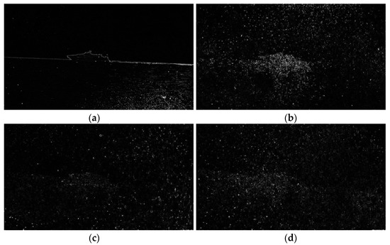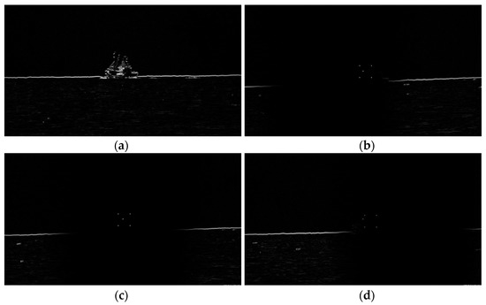 Edge detection result of the mast-obscuration scene: (a) A scene before the object is obscured; (b) The scene 1 where the object is obscured; (c) The scene 2 where the object is obscured; (d) The scene 3 where the object is obscured.
