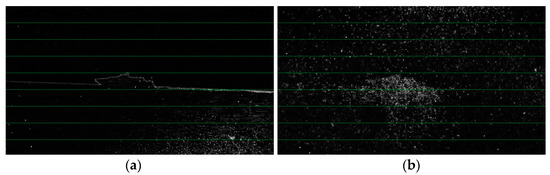 The analysis of the edge detection result shows that the sea–sky line appears to be interrupted due to mast occlusion. In addition, the sea region under the mast occlusion has no sea noise information. According to the above image features, this paper segments the image horizontally and counts the number of bright spots within each region. As shown in Figure 9, a schematic diagram of the image segmentation is shown.