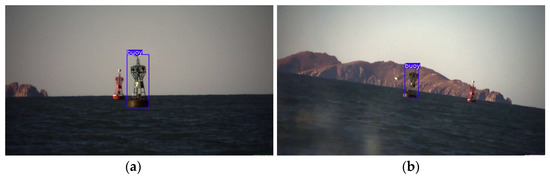 As shown in Figure 15a, it is the test of the radar-guided object extraction algorithm in the case of multiple buoys in simple background. In the same field of view, there are two objects of the same type. After the marine radar detection, according to the mission requirements, the decision module autonomously selects the object closest to the USV. In this image, the green buoy is the object guided by the radar, and the red buoy is successfully filtered out. As shown in Figure 15b, it is the test of the radar-guided object extraction algorithm in the case of multiple buoys in a complex background. The background behind the buoy is complicated. During the test, the red buoys was successfully filtered out.