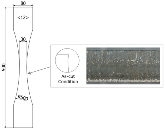 To analyze the fatigue performance of thermal cut steel edges at sub-zero temperatures, a specimen design for all test series at the different temperatures is considered. All specimens are made of higher strength structural steel S355 (AH36) and are cut out of one plate via plasma cutting. The chemical composition of the used steel and the mechanical properties are listed in Table 1. The plasma cutting was performed in a shipyard and corresponds to typical ship building practice. The specimens are 500 mm long, 80 mm wide at both ends, and have a thickness of 12 mm. The specimens are hourglass shaped and have a reduced width of 30 mm by a radius of 500 mm in the center (see Figure 2).