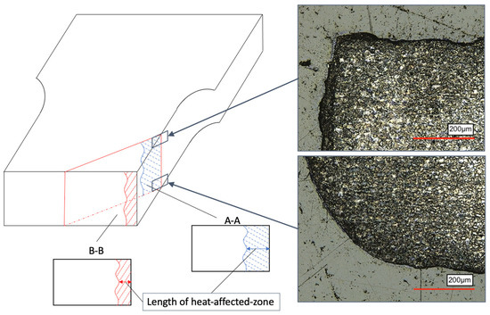 Before testing, the specimen specifics are recorded. For this, the geometry of the smallest cross section in the center is measured as well as the angular misalignment. Following the specifications of ISO 9013 [13], the specimens show a good surface quality (quality range 2). In case of plasma cutting, surfaces with low roughness values are produced, so that the roughness is in generally low, and the fatigue performance depends more on the cut edge defects [2,3]. The cut edges were not treated after cutting. Hence, the fatigue tests were carried out in as-cut condition. Figure 3 shows the microstructure of the polished inclined cross section of one of the specimens in the heat-affected zone.