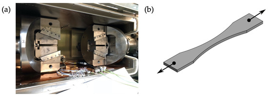 The fatigue testing of the specimens was carried out on a Schenk horizontal resonance testing machine. All tests were conducted with a stress ratio (ratio between the minimum stress value and the maximum stress value) of R = 0.1 and the failure criterion was a clearly visible crack. Experimental tests were conducted under uniaxial load in longitudinal direction of the test bodies. During testing, cooling was achieved by vaporized nitrogen, which was blown into a temperature chamber. For an almost constant temperature of −20 °C and −50 °C during the tests, the amount of nitrogen was controlled by a temperature gauge [9]. Additionally, the temperature of both the specimen and the air in the chamber was measured. An illustration of the clamping jaws of the resonance testing machine with the temperature chamber is shown in Figure 4.