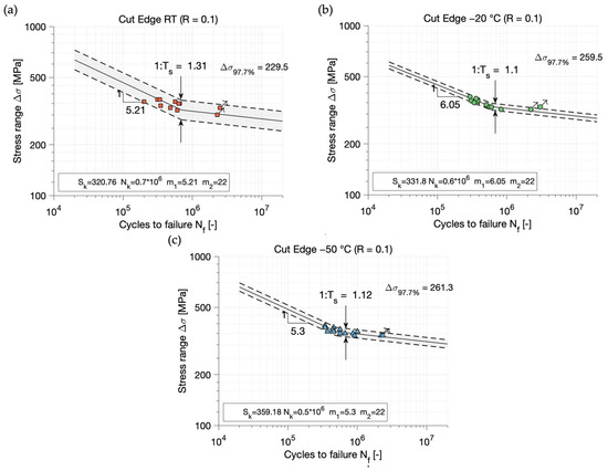 In case a specimen did not fail before cycles were reached, those runouts are marked with an arrow in the S-N diagrams. The results for all three test temperatures are shown in the following Figure 5a–c.