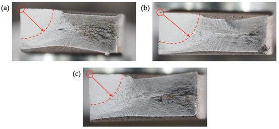 As von Bock und Polach et al. (2022) [16] showed, the position of the crack initiation can have an influence on the fatigue strength of thermal cut edges. The crack initiation at untreated thermal cut edges starts, in most cases, at the corner of the cut edge [17]. A distinction is made between cracks that appear in the grooves on the thermal cut steel surface and cracks that appear in the corner of the cut edges, in case of post-treated specimens in the chamfer [1]. The crack growth can be traced by looking at the fracture surface. Thereby, it is found that all fracture surfaces (independent of the test temperature) show the same position for crack initiation. Figure 7 shows the fracture surface of specimens, which are tested at RT (a), −20 °C (b), and −50 °C (c). The crack initiation starts at the topside corner of the cut edges and propagates to the middle of the fracture surface. When the crack length reaches a certain size, the stiffness of the specimen decreases, and the longitudinal displacement becomes larger due to the constant load amplitude. At pre-set threshold values for displacement and frequency change, the resonance testing machine stops the loading procedure.