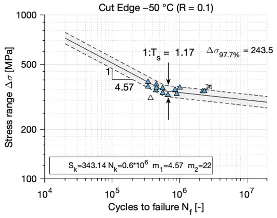 The crack positions are measured and the nominal stress according to the local cross section is corrected. This procedure can lead to a sharp drop in the stress range when the crack location is relatively far away from the smallest cross section. The total stress at the crack location is a combination of the nominal stress and the stress concentration and must be higher than the total stress at the smallest cross section. Hence, it can be discussed if the nominal stress at the smallest cross section might not be more representative than the nominal stress at the actual crack location. However, for this study, a statistical evaluation is also carried out for the recalculated test series, where the nominal stresses at the actual crack location are used. The statistical evaluation can become a problem in case single values deviate too much from the others. This can be due to a difference in shape but also to changes in the test conditions. Such outliers lead to a very wide scatter band, which represents the test results incorrectly [18]. To deal with such outliers a graphical analysis is used as there are no methods for a mathematical evaluation [18]. In the test results at −50 °C, one outlier is found. In this case, the crack originates 48 mm out of the middle of the specimen. Plotting the modified stress range of this test next to the S-N curve of the remaining 13 data points, it is seen that the value does not fit in the scatter band. This is shown in Figure 9. Thereby, the statistical evaluation was conducted with the maximum likelihood method with an optimization of the knee point. In case of the tests at −20 °C and RT, no outliers were observed.