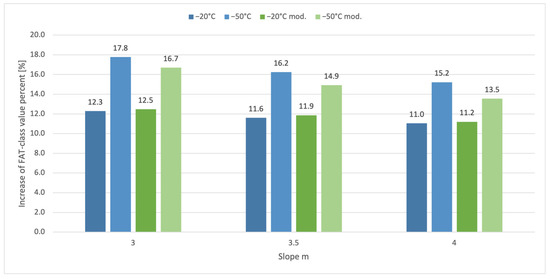 The increase in fatigue strength is represented by the increase in FAT-class values. In Figure 10, the percentage rises to the FAT-class value at RT for the different slopes are shown. Thereby, the increase is the greatest for a fixed slope of m = 3 and smallest for m = 4. However, for all used slopes, a significant increase is observed.