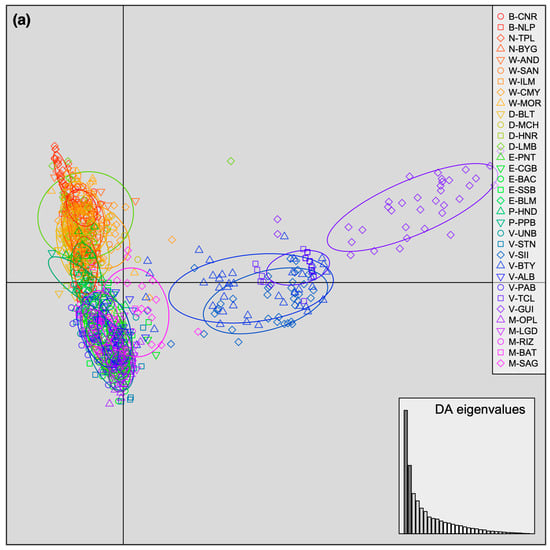 - Jombart, T.; Devillard, S.; Balloux, F. Discriminant analysis of principal components: A new method for the analysis of genetically structured populations. BMC Genet. 2010, 11, 94. [Google Scholar] [CrossRef] [PubMed]