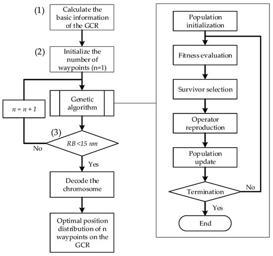 To optimize the positions of the waypoints on the GCR, this study applied the genetic algorithm [35,36] to propose a genetic algorithm-based optimization method for the waypoints on the GCR (i.e., the GA method). As shown in Figure 3, the method mainly includes three parts: