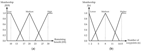 Schematic diagram of the membership function of variables: (a) the remaining benefit and (b) the number of waypoints.
