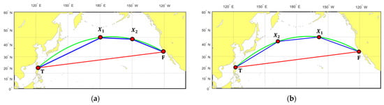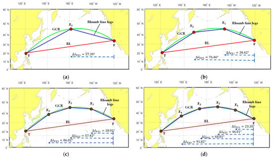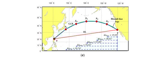 where represents how much the sum of each RL leg distance compares to the GCR, and represents the RL leg distance from F to the first waypoint, which can be calculated through Equations (3)–(5).