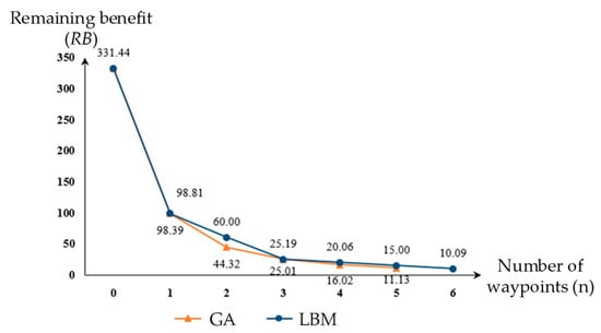 In order to make more comparisons, the other five routes were listed in Table 3. It can be seen that under the same stopping process conditions, the used by the GA method was less; when the was the same, the of the GA method was lower. These results confirm again that the optimal position distribution of waypoints on the GCR can be achieved through the optimization process of the GA method, which solves the problem that the position of waypoints obtained by LBM is not the optimal solution.
