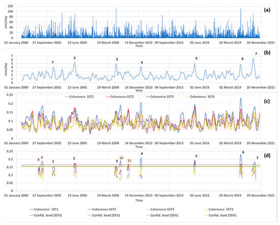 2.4. Coherence and Phase of Rainfall and SST Anomalies According to Harmonic Modes