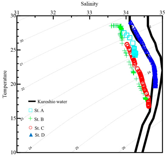 In this study, surface water temperatures varied from 25.8 to 29.1 °C, while the bottom of the euphotic zone temperatures varied from 16.9 to 23.8 °C and salinity throughout the water column varied from 33.6 to 34.8 psu (Table 1, Figure 2). In Figure 2, the vertical values of the CTD data are plotted on a T–S diagram, while typical Kuroshio water (KW) is shown on a reference curve. It was found that KW primarily occurred at St. D and the upwelled Kuroshio subsurface water (UKSW) affected the environmental characteristics of St. C. (Figure 2). Direct measurement of light intensity at 30 m of St. A showed that it declined to 3% of its value at the surface, and <1% at 200 m of St. C and D (Table 1). Furthermore, a higher chl a concentration (0.4 µg L−1) was observed at St. C due to the location being near the upwelling region (Table 1).