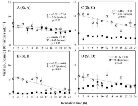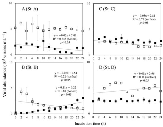 Viral dynamics over the dilution experiment at the surface (□) and bottom of the euphotic zone (■) collected at the study stations A, B, C, and D. Error bars represent SD values. (—) is the regression line for sunlit surface and bottom of the euphotic zone.