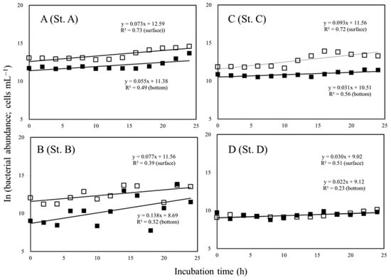 Dynamics of the bacterial abundance in the surface (□) and bottom of the euphotic zone (■) layers at the study stations A, B, C, and D during the dilution experiment. (—) is the regression line for sunlit surface and bottom of the euphotic zone.