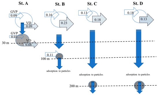 Next, we calculated the gross viral production (GVP) based on the estimations of NVP and VD. According to the results of the study, the GVP ranged from 0.09 to 0.18 × 105 viruses mL−1 h−1. The highest GVP was observed in the surface water at St. D at a value of 0.18 × 105 viruses mL−1 h−1 (Table 2).