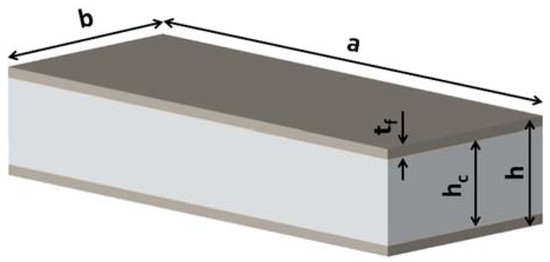The geometrical descriptors of the honeycomb panel are shown in Figure 2, where a is referred to as panel length, b as panel width, tf is the thickness of skins, hc is the core’s thickness, and h is the overall sandwich thickness.