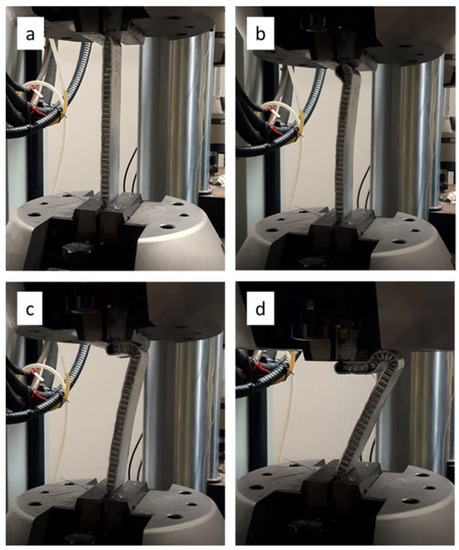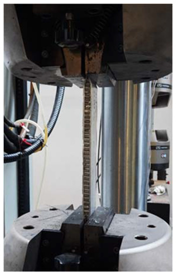 Experimental tests were performed with a servo-hydraulic load machine (INSTRON 8854, Instron Inc., Norwood, MA, USA) using hydraulic grips, which enabled the specimens to be firmly held, as shown in Figure 3. The constraint applied to the specimens’ extremities was intended to model fully fixed boundary conditions.