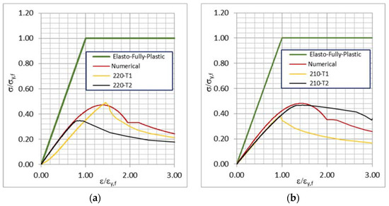 Stress–strain relationships of elastic–fully plastic numerical and experimental results of specimens T1 and T2 for a span of 220 mm (a) and 210 mm (b).