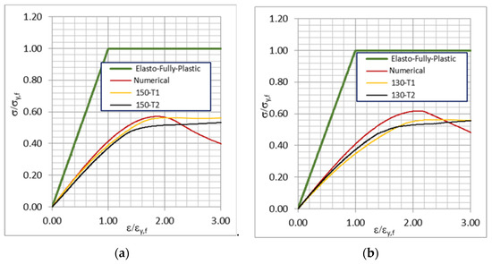 Stress–strain relationships of elastic–fully plastic numerical and experimental results of specimens T1 and T2 for a span of 150 mm (a) and 130 mm (b).