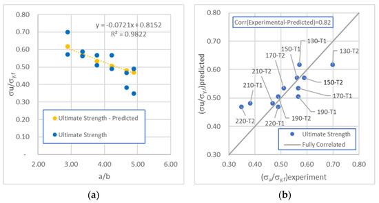 The experimental stress–strain relationships show initial linear growth and a good follow-up to the ultimate strength and subsequent drop in structural capacity. The ultimate strength is inversely proportional to the ratio a/b with an almost linear relationship, as shown in Figure 9 and Figure 10a. A correlation coefficient was estimated (about 0.82) to verify the scatter between experimental and predicted results, as seen in Figure 10b.