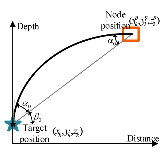 As shown in Figure 1, under the influence of transmission delay, there is a significant difference between the target position at the sampling moment and the real position corresponding to the measurement. Therefore, the transmission delay is introduced into the target state model. Considering the ray tracing and depth-dependent sound velocity profile [32] as shown in Figure 2, the transmission delay between the target and the sensor node can be expressed as: