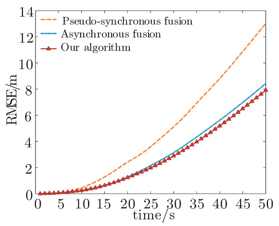 In this study, simulations were carried out to verify that the effect of particle filter improved. Besides the proposed algorithm, the pseudo-synchronous fusion algorithm using the traditional PF [35] and the asynchronous fusion algorithm based on delay estimation [30] are also compared. The pseudo-synchronous fusion algorithm ignores the problem of transmission delay and regards the received measurements as synchronous data for fusion. The asynchronous fusion algorithm based on delay estimation takes the problem of inconsistency in propagation delay into consideration. However, it does not consider the ray tracing theory. Figure 4 shows the RMSE of each fusion algorithm.