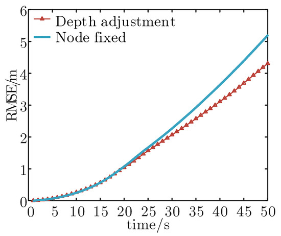 The effect of multiplicative noise on depth adjustment cannot be ignored. We make a comparison between the tracking performance of depth adjustment and node fixation under different multiplicative noises in Figure 9, and the detailed average RMSE and improvement under different multiplicative noises is shown in Table 4. From Figure 9, it can be determined that the RMSE of the depth adjustment algorithm does not decrease significantly with the increase in the multiplicative noise variance, because it will also be used as a part of the height adjustment objective function in the algorithm design process, and the same is true of height adjustment. Moreover, as the variance of multiplicative noise increases, the proposed algorithm improves the tracking performance more significantly than the algorithm with fixed nodes, which shows that the proposed algorithm is more suitable for measurement environments with severe multiplicative noise interference, especially in an underwater environment.