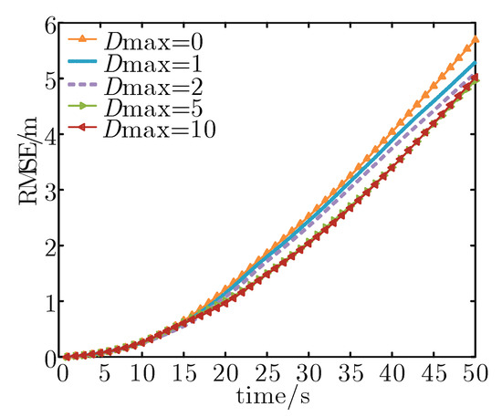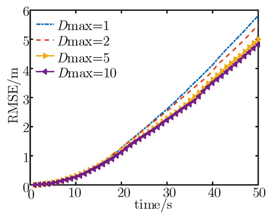Considering that the maximum value of the node’s moving distance determines the extreme value of the height difference between the node and the target, the value of Dmax will affect the performance of the tracking algorithm based on depth adjustment. Figure 7 presents the tracking performance under different Dmax and Table 3 gives the detailed average RMSE and moving distance. It can be found from Figure 7 that the tracking error decreases with the increase in Dmax. This is because the larger the Dmax, the faster the mobile node reaches the topology with the maximum FIM.