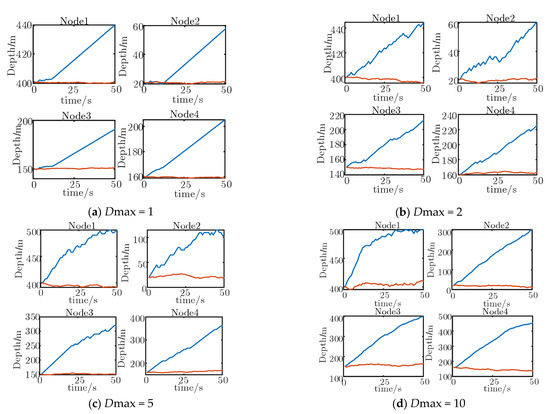 Figure 8 further shows the depth variation of nodes under different Dmax. It can be seen from Figure 8 that the depth variation presents a linear relationship because the adjustment scheme given in (31) makes each node move in the direction where the height difference is at its maximum. At the same time, the target moves in constant velocity, so the moving distance of nodes varies linearly, as shown in Figure 8. As Dmax increases, the inflection point appears earlier. This also shows that underwater sensor nodes can reach the optimal depth position faster, providing more reliable and accurate measurements for target tracking. Combining Figure 8 and Table 3, it can be found that the tracking error and the average moving distance are a pair of contradictory quantities, and how to balance the relationship between them is a very important topic.