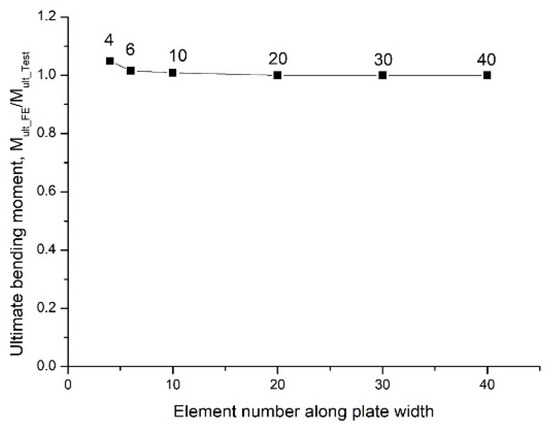 Generally, a rectangular element with a length–width aspect ratio close to 1.0 was chosen for the non-linear FE analysis. Under the static loading condition, the meshing density of 6~10 elements in one plate width is enough to obtain a reasonable calculation result. Figure 4 shows that the calculation results of the ultimate bending moment of the box girder with 10 elements along one plate width is a little lower than that with four or six elements. The initial imperfection of two half-waves with an amplitude of 0.9 mm is applied in the analysis. When the element number exceeds 10, the calculation results of the ultimate bending moment show a stable value.