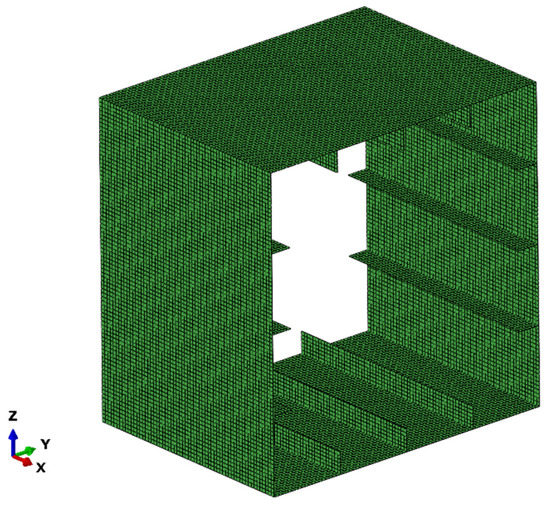 In the dynamic explicit calculation method, the stability limit of the calculation has a relationship with the characteristic element length, i.e., the minimum element length. The shorter the element length is, the shorter the calculation time of the increase step. In order to control the calculation time of the structural response, it had better not use an overfine mesh density. In the following analysis, a mesh density with 20 elements along one plate width was used, as shown in Figure 5. The meshing size is about 9 mm for the FE analysis. There are 20 elements along the plating width, 60 elements along the plating length, six elements along the stiffener web height and eight elements along the frame web width.