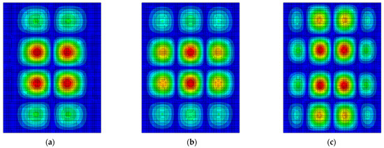 For the box girder in this paper, a = 540 mm and b = 180 mm; therefore, the buckling half-wave number is m = 3. In order to trigger the failure mode, the initial imperfection can be assumed as the buckling mode with three half-waves in the plate length direction and one half-wave buckling mode in the plate width. This paper also considers the effect of initial imperfection with two half-waves and four half-waves in the plate length direction, as shown in Figure 6. The initial imperfection is applied to the compressed upper panel of a box girder under the bending moment.