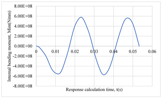 In the early dynamic stage, the internal moment at the mid-span is large and the upper stiffened panel is in compression, which is similar as the sagging moment. After the peak of the dynamic load, the bending moment at the mid-span reduces progressively, and then the opposite bending deformation of the box girder may be activated, leading to the opposite value of the internal bending moment, which is similar to the hogging moment. Therefore, the sagging–hogging internal moment will occur and alternately change over time, as shown in Figure 8. When the applied external bending moment reduces to 0 at a response calculation time of in Equation (3), the internal bending moment will still occur due to the girder vibration deformation.