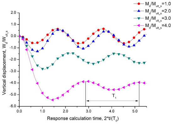 The vertical displacement responses at the mid-span as the response calculation time for the M2 box girder are shown in Figure 9. For Md = 1.0 Mult_s, the box girder shows an elastic response, and the hogging (bending upwards)–sagging (bending downwards) vibration deformation amplitude is almost symmetrical. For Md = 2.0 Mult_s, the sagging deformation is larger than the hogging. For Md = 3.0 Mult_s, the vibration mode has been changed, and the value of dynamic deformation is always negative due to the large plastic deformation after dynamic load. For Md = 4.0 Mult_s, the vibration period T1 (between two neighboring peaks in the free vibration stage) after dynamic load action exceeds the natural vibration period T0 due to large failure areas induced by local buckling and plastic deformation.