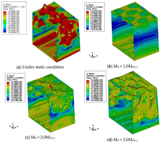 The Mises stress and deformation distribution at the time of the maximum vertical displacement for the mid-span of the M2 box girder are shown in Figure 8. Only in the load case of Md = 1.0Mult_s was the stress lower than the static yield strength. The maximum value of the Mises stress for the load case of Md = 4.0Mult_s is about 400 MPa, which is higher than the static yield strength. Based on Equation (1), the strain rate for the box girder is about 1/s~10/s, which shows the dynamic characteristics.